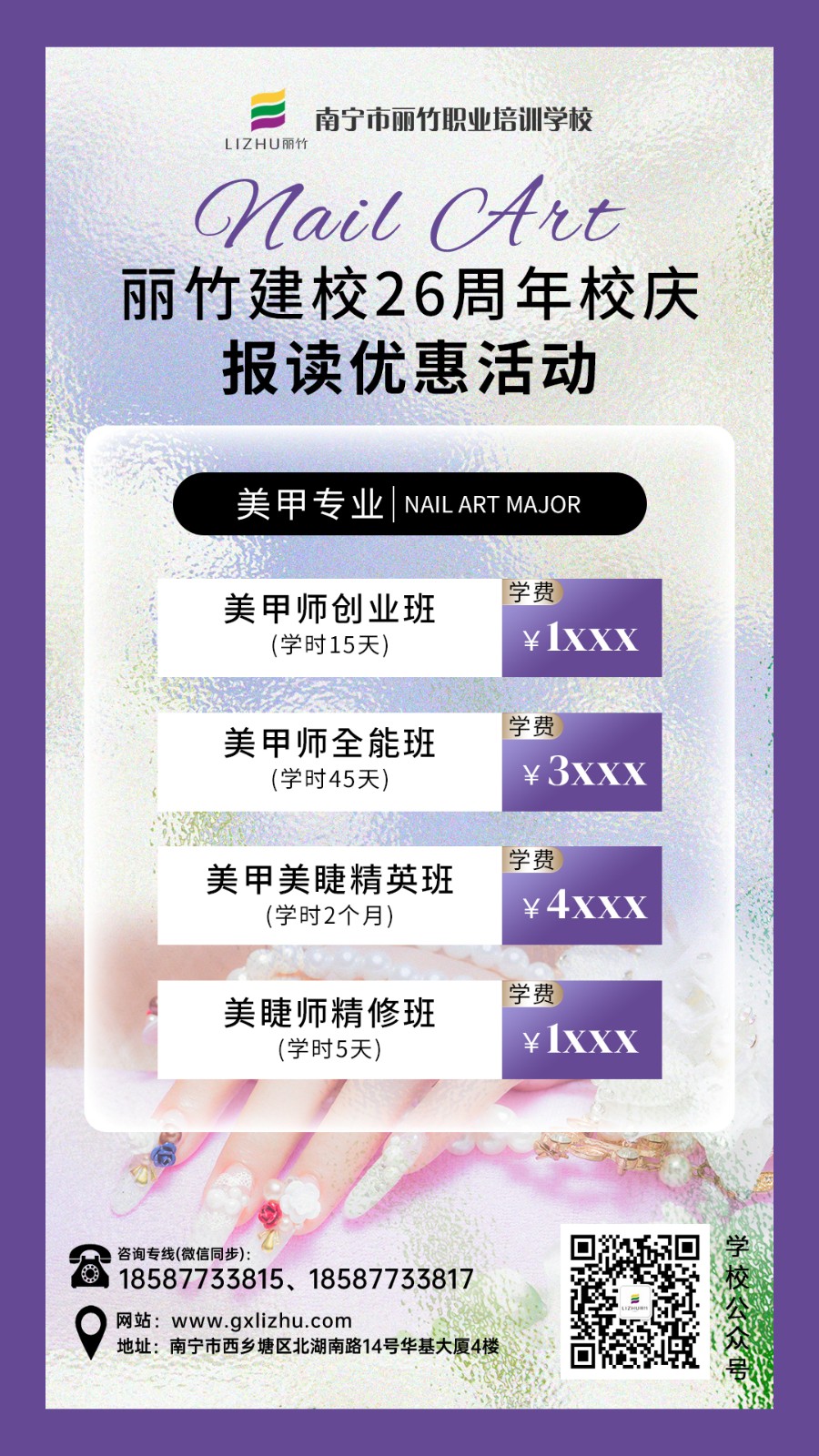 如果你對(duì)美甲感興趣,想知道廣西美甲哪家比較好?或是想知道廣西美甲培訓(xùn)哪家有實(shí)力?麗竹學(xué)校作為廣西美業(yè)培訓(xùn)中的佼佼者,26年專(zhuān)業(yè)教學(xué),口碑實(shí)力并存,想學(xué)美甲歡迎到麗竹學(xué)校參觀試聽(tīng),了解更多優(yōu)惠報(bào)名福利,滿(mǎn)意之后在報(bào)名!